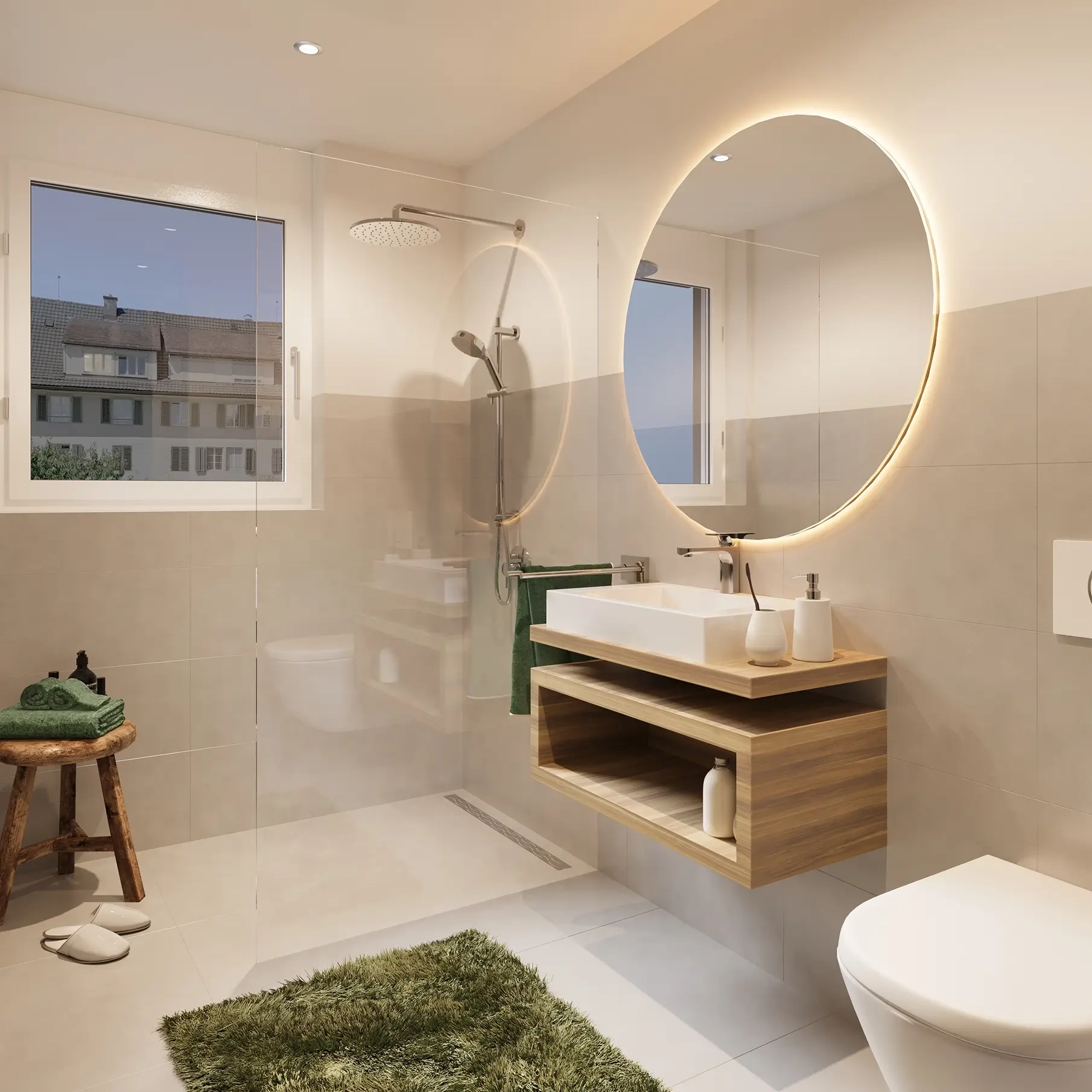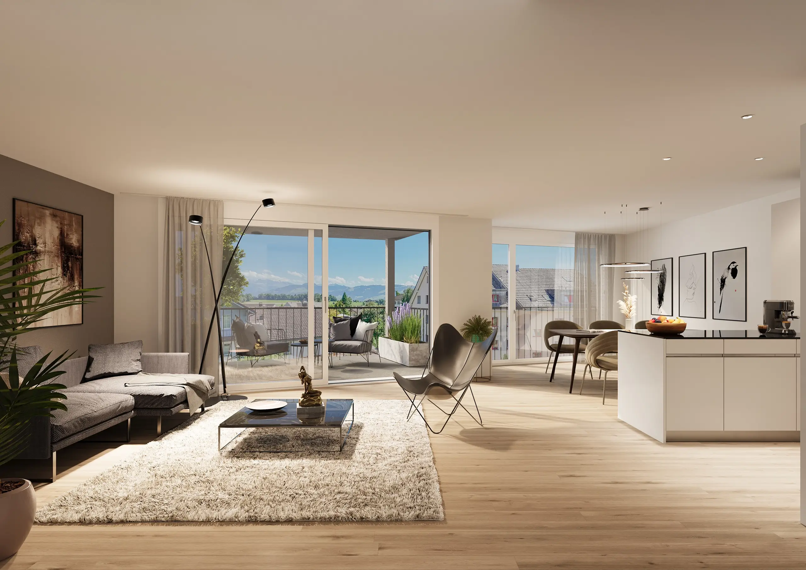 Die Eigentumswohnungen verbinden stilvolle Architektur mit modernstem Wohnkomfort. Grosszügige Fenster mit 3-fach- Isolierverglasung lassen viel Tageslicht in die Räume, während elektrische Rafflamellenstoren für flexible Beschattung sorgen. Die Böden – ob edles Holz oder hochwertige Keramik – können nach Wunsch gewählt werden und unterstreichen die persönliche Note jedes Zuhauses. Die Küchen sind hochwertig ausgestattet mit Kunstharzfronten, Granitabdeckung und modernsten Geräten, die den Alltag erleichtern und das Kochen zum Vergnügen machen. In den Bädern sorgen Glasduschtrennwände, keramische Beläge und sorgfältig ausgewählte Armaturen für eine elegante Wohlfühlatmosphäre. Jede Wohnung verfügt über einen eigenen Waschturm – für maximale Unabhängigkeit und Komfort. Ein Ausbau, der Nachhaltigkeit, Qualität und Wohnatmosphäre harmonisch vereint.